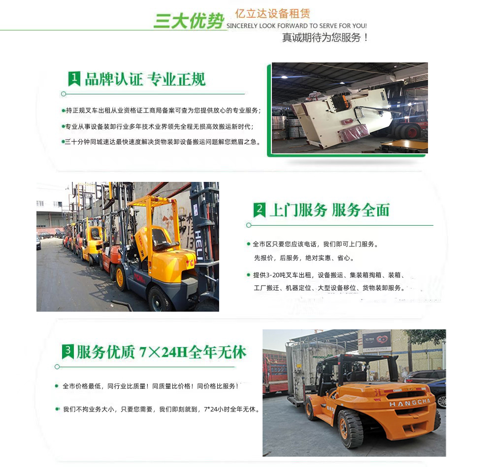 亿立达设备租赁有限公司是工商局准许的天津铁道职业技术学院专业叉车出租公司,公司本着诚信、服务、效率、创新的经营理念,用精湛的技术,真诚的服务,为众多客户提供优质的服务,同时获得信赖与支持。专业提供天津铁道职业技术学院3-20吨叉车出租、叉车租赁、设备搬运、集装箱掏箱装箱、机器移位定位、货物装卸、工厂搬迁、安全可靠,收费透明,价格便宜,随叫随到,24小时上门服务!本公司叉车吊车师傅对各种设备搬运装卸都有深刻探讨和研究。很多的疑难设备搬运,通过我公司的叉车师傅都能迎刃而解。对各种进口设备、国产机器、大型设备搬迁、高难度搬迁、各种精密仪器、医疗设备、科研设备等都能搬运; 提供全市 24 小时上门装卸搬运服务。同时提供厂房搬迁服务。 ...